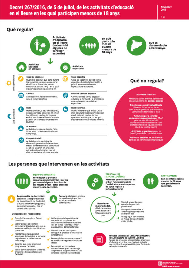 El Decret 267/2016, de les activitats d’educació en el lleure en les quals participen menors de 18 anys, afecta a qualsevol entitat i/o organisme que organitzi activitats de lleure per a menors en període no escolar, incloses les esportives.