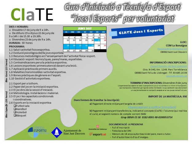 Us informem que el Consell Esportiu del Baix Llobregat amb la col·laboració de l’ajuntament de Sant Just Desvern organitzen un Curs d’Iniciació a Tècnic/a d’Esports “Jocs i Esports” (CIaTE) per voluntariat que començarà el proper dissabte 17 de juny al matí. Per a més info.