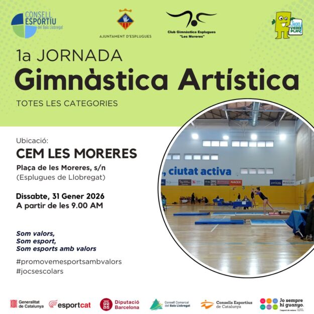 El proper dissabte 31 de gener de 2026 a partir de les 9.00h tindrà lloc al CEM Les Moreres d’Esplugues de Llobregat, la 1ª Jornada Comarcal de Gimnàstica Artística Escolar del curs 25-26.