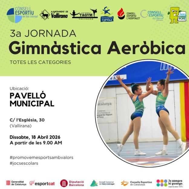 El proper dissabte 18 d’abril de 2026 a partir de les 9.00h tindrà lloc al Nou Pavelló de Vallirana, la 3ª Jornada Intercomarcal de Gimnàstica Aeròbica Escolar d’aquest curs 2025-2026.