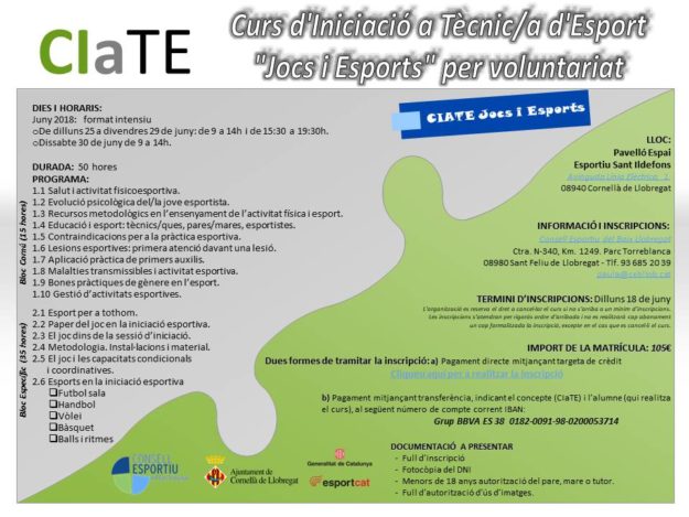 Us informem que el Consell Esportiu del Baix Llobregat i l’Ajuntament de Cornellà organitzen un Curs d’Iniciació a Tècnic/a d’Esports “Jocs i Esports” (CIaTE) per voluntariat. El curs de 50 hores (fonamentalment pràctic) facilita la formació bàsica per a la realització d’activitats esportives en l’àmbit extraescolar.