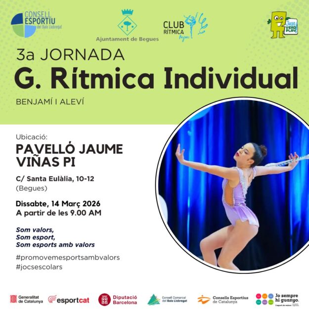 El proper dissabte 14 de març de 2026 a partir de les 9.00h tindrà lloc al Pavelló Jaume Viñas Pi de Begues, la 3ª Jornada Comarcal de Gimnàstica Rítmica Indiviual Escolar d’aquest curs 2025-2026 amb les categories benjamina i alevina.