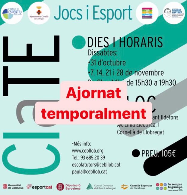 Us informem que el Consell Esportiu del Baix Llobregat i l’Ajuntament de Cornellà de Llobregat organitzen un Curs d’Iniciació a Tècnic/a d’Esports “Jocs i Esports” (CIaTE) per voluntariat. El curs de 50 hores (fonamentalment pràctic) facilita la formació bàsica per a la realització d’activitats esportives en l’àmbit extraescolar.
