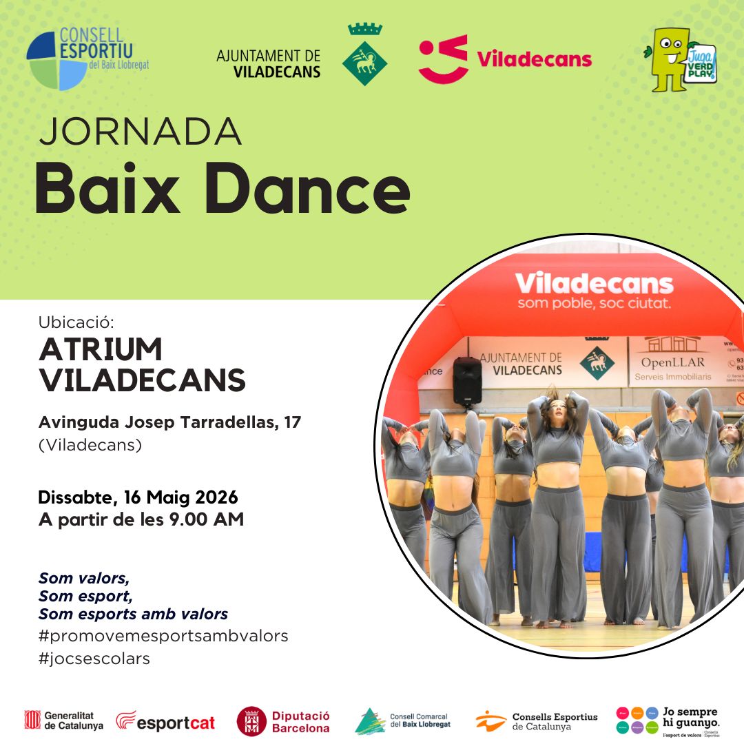 El proper dissabte 16 de maig de 2026 a partir de les 9.00h tindrà lloc al Pavelló Atrium de Viladecans, la Jornada Baix Dance d’aquest curs 2025-2026.