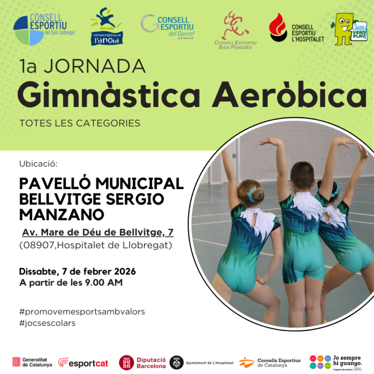 El proper dissabte 7 de febrer de 2026 a partir de les 9.00h tindrà lloc al Pavelló Municipal Bellvitge Sergio Manzano de l’Hospitalet de Llobregat, la 1ª Jornada Intercomarcal de Gimnàstica Aeròbica Escolar d’aquest curs 2025-2026.