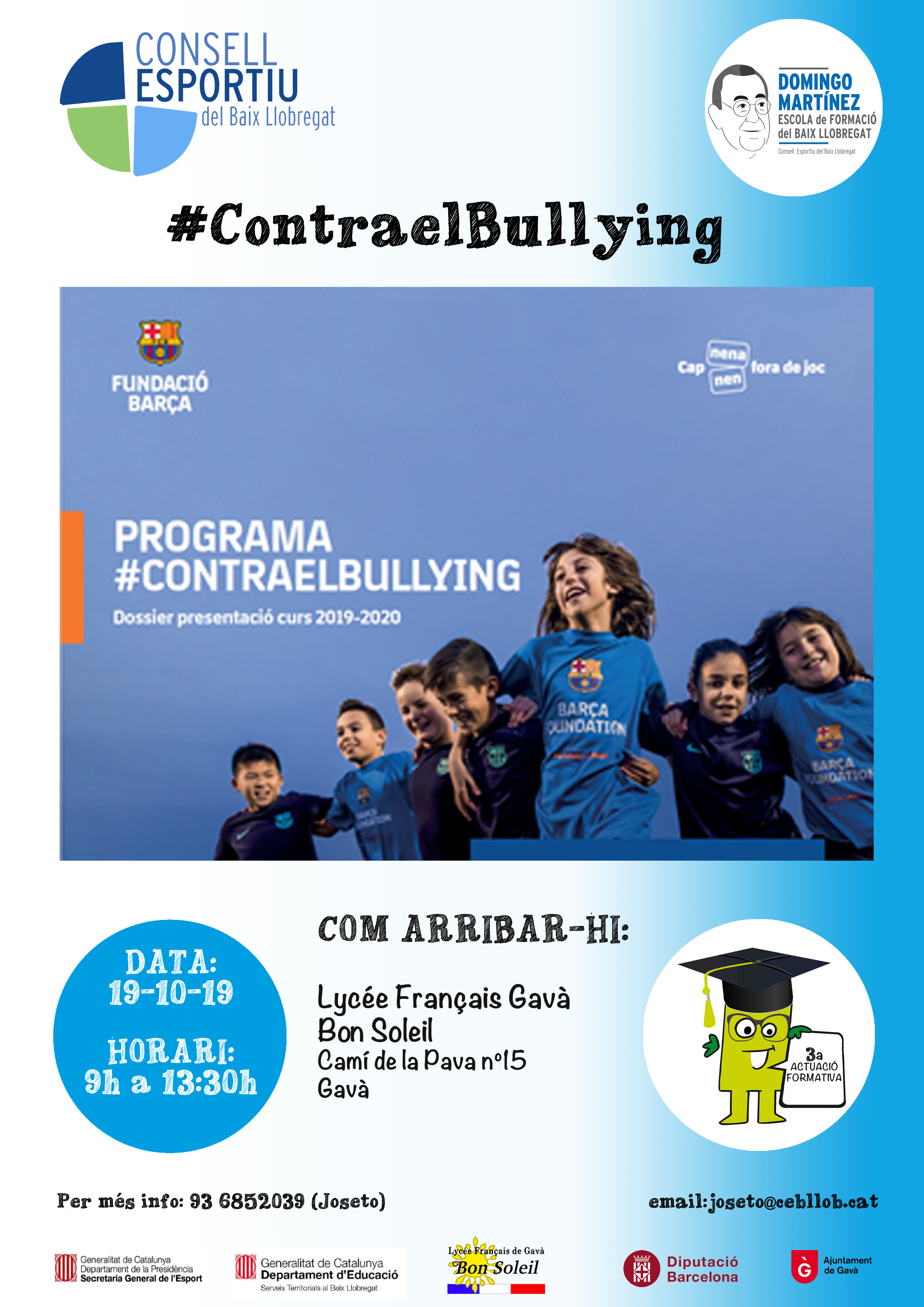 DetailsUs informem que les inscripcions per a la tercera actuació formativa ja estan obertes, serà el dissabte 19 d’octubre sobre “#ContraelBullying” de 9 a 13:30h a Lycee Français de Gavà Bon Soleil de Gavà amb un reconeixement de 4,5 hores del Departament d’Educació.