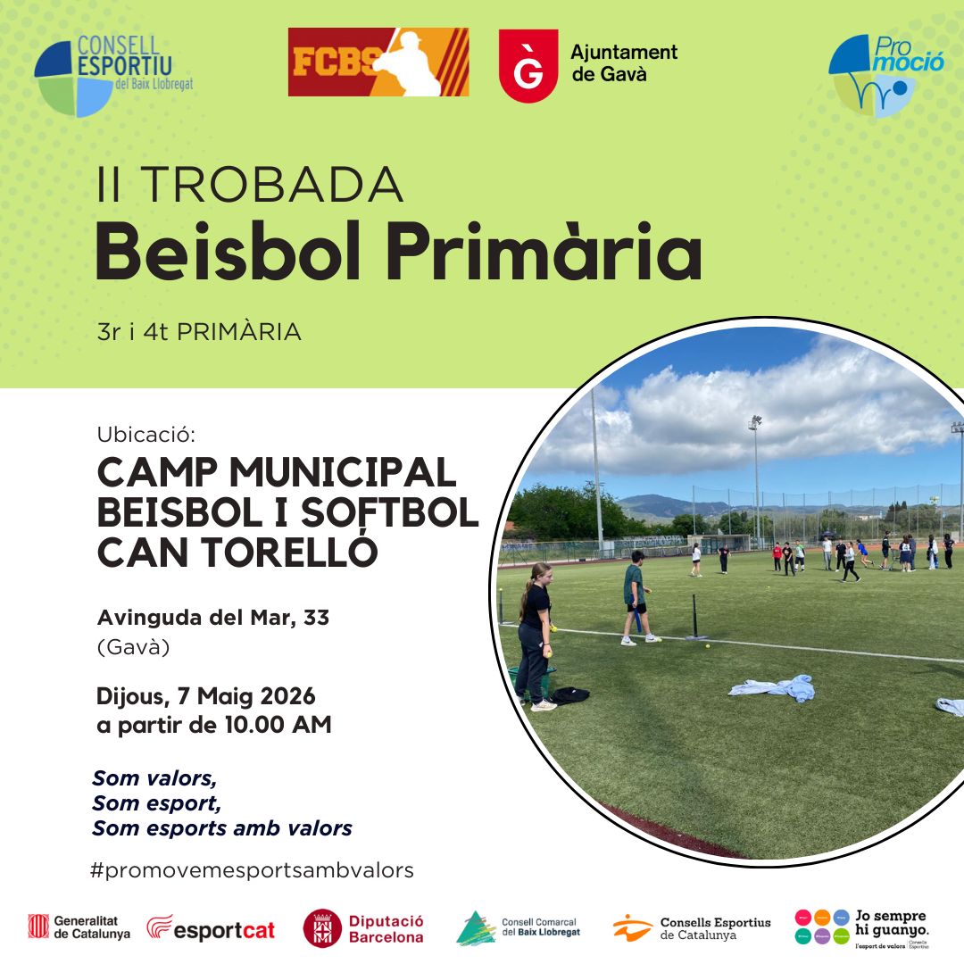 El proper dijous 7 de maig de 2026 a partir de les 10.00h tindrà lloc al Camp Municipal de Beisbol i Softbol Can Torelló de Gavà, la Trobada de Beisbol de Primària