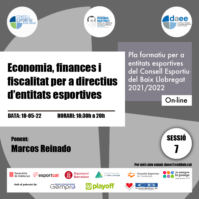 DetailsLa 7a sessió ON-LINE del pla formatiu per a entitats esportives del Consell Esportiu del Baix Llobregat del curs 2021/2022 porta per nom Economia, finances i fiscalitat per a directius d’entitats esportives. En aquest enllaç trobareu informació detallada de la sessió: Economia, finances i fiscalitat per a directius d‘entitats esportives. Sessió 7: La 7a sessió…