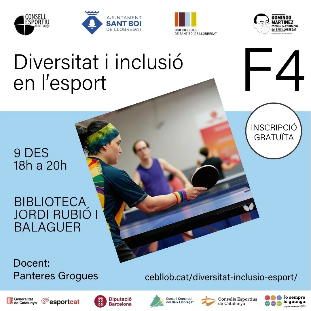 Formació 4: “Diversitat i inclusió en l’esport” es realitzarà el 9 de desembre de 18h a 20h (Lloc: Biblioteca Jordi Rubió i Balaguer, Carrer Baldiri Aleu, 6, 08830 Sant Boi de Llobregat, Barcelona)